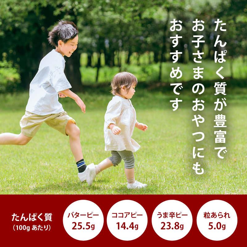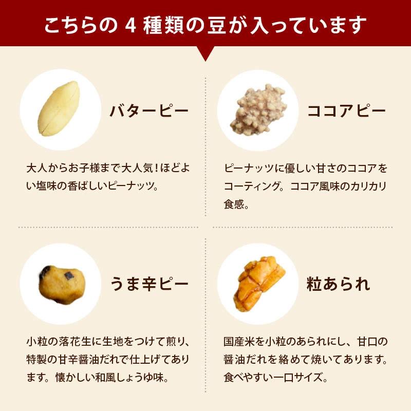 原材料◆バターピー落花生:(中国)、植物油、食塩◆ココアピー:落花生(中国)、砂糖、ココアパウダー、でん粉、食塩◆うま辛ピー:落花生(中国)、小麦粉、しょうゆ加工品(醤油、砂糖、その他)、砂糖、寒梅粉ミックス(澱粉、米粉)、澱粉、植物油、海苔】◆小粒餅:でん粉(アメリカ産トウモロコシ使用、国内製造)、米(国産)、砂糖、しょうゆ、デキストリン、ガーリックパウダー、発酵調味料、唐辛子/加工デンプン、調味料(アミノ酸等)、カラメル色素、パプリカ色素、ベニコウジ色素、香辛料抽出物、(一部に小麦,大豆を含む)栄養成分表示(100gあたり)エネルギー:541kcal たんぱく質:19.8g 脂質:34.9g 炭水化物:40.8g 食塩相当量:0.5g(この表示値は、目安です)保存方法直射日光、高温多湿を避け冷暗所で保存してください。当社「4種の厳選ミックス豆」に使用のベニコウジ色素について当社の「4種の厳選ミックス豆」には、健康被害が報道されている小林製薬株式会社の紅麹原料は一切、使用しておりません。ご安心ください。