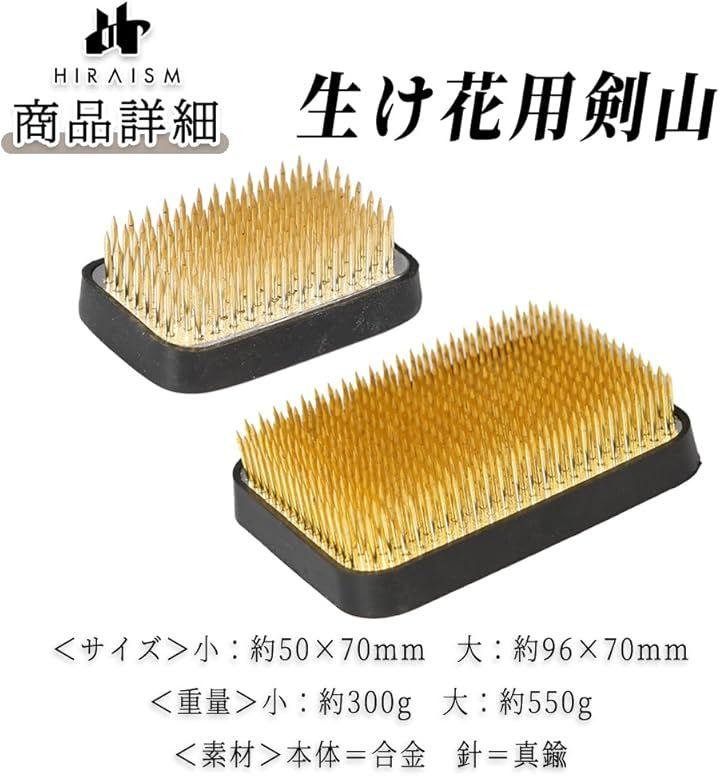 「商品内容」生け花用剣山 <サイズ>小:約50x70mm 大:約96x70mm <重量>小:約300g 大:約550g <素材>本体=合金 針=真鍮