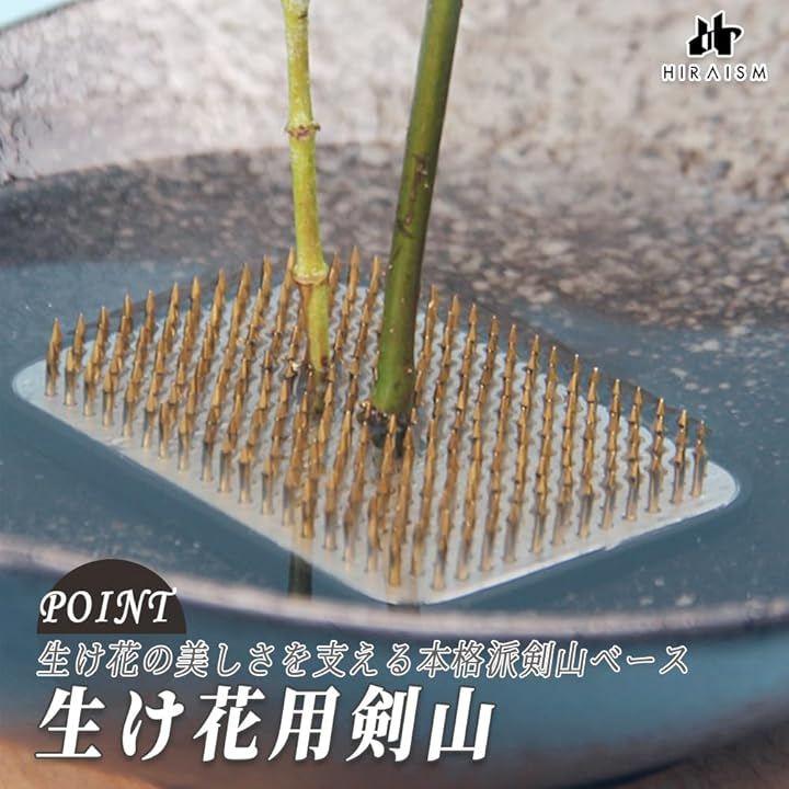 重厚感ある真鍮製の針と安定感のある台座により、生けた構図が崩れにくく、初心者から上級者まで幅広くお使いいただけます。