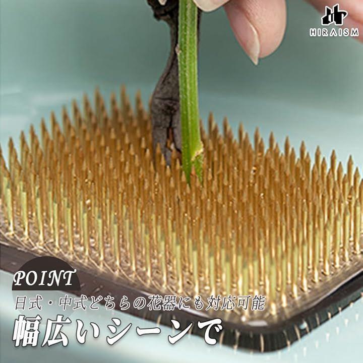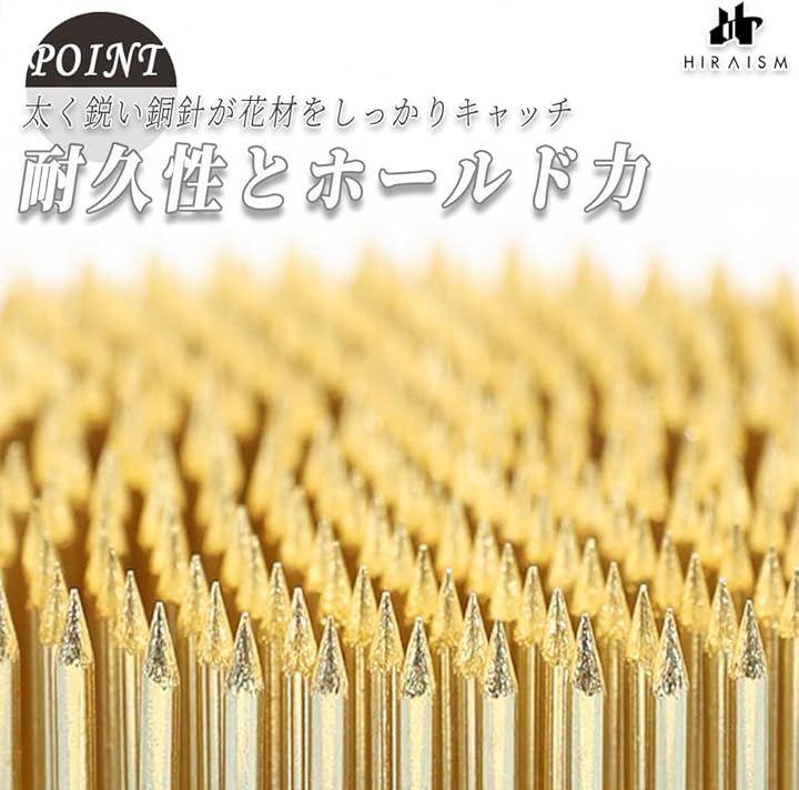 「真鍮針仕様で耐久性とホールド力を両立」太く鋭い銅針が花材をしっかりキャッチし、繊細な角度調整や大胆な構成も自在にサポート。