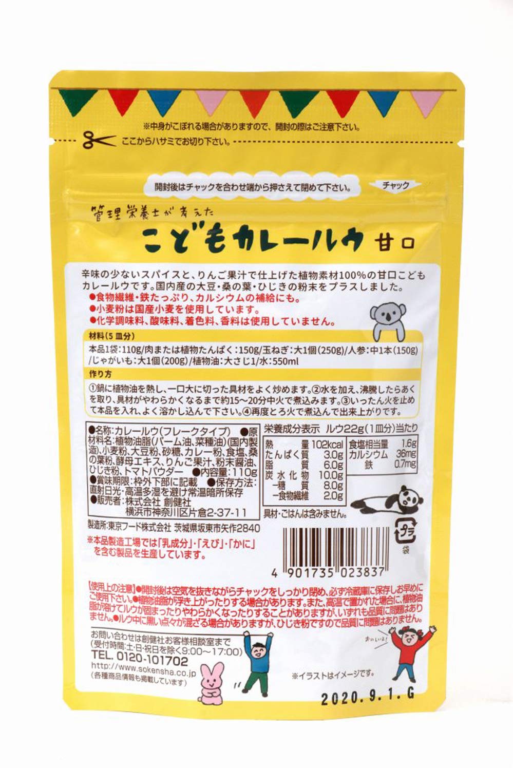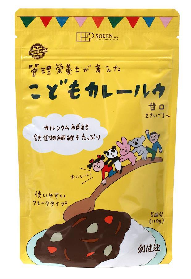 管理栄養士監修の辛味の少ないスパイスと、りんご果汁で仕上げた植物素材100%の甘口こどもカレールウです。(フレークタイプ・5皿分)。2歳頃のお子様からお召し上がりいただけます。お母さんの思いを反映し自然素材の国産大豆・桑の葉・ひじきの粉末を加えて、鉄・食物繊維、カルシウムの栄養を強化しました。小麦粉は国産小麦を使用。化学調味料、酸味料、着色料、香料等の不要な合成添加物は使用しておりません。フレークタイプなので、ドライカレー、ピラフ、炒め物などにもご利用いただけます。