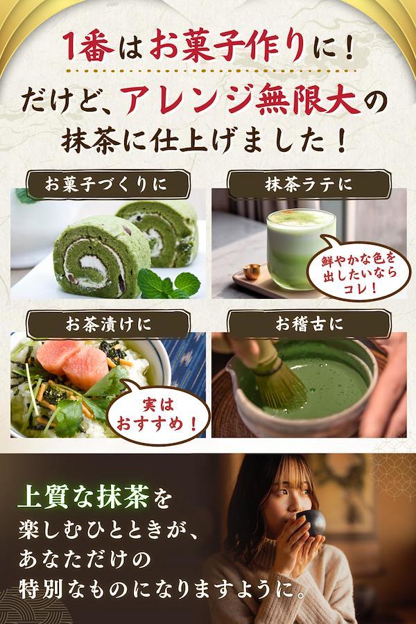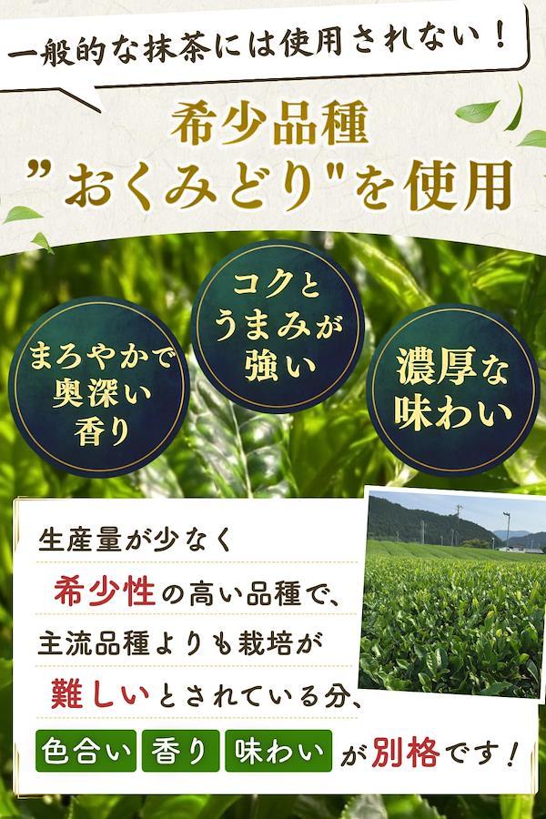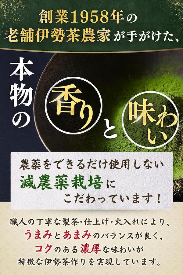 【賞味期限は製造日から1年】ごゆっくりお使いいただけるよう、賞味期限が残り6ヶ月以上の期間がある抹茶パウダーをお届けします!【創業1958年の老舗茶農家製造】創業から60年以上にわたる歴史を受け継ぐ伊勢茶農家が厳選したブランド茶葉「伊勢茶」だけを使用し、真心込めて丁寧に仕上げました。【全国100店舗以上の使用実績】本商品と同じ原料の抹茶は、全国のカフェやレストランなどで幅広く使われています。全国各地のプロにも愛用される抹茶を、ご家庭向けに商品化しました!【希少品種おくみどりを使用】栽培が難しいとされる希少品種「おくみどり」を贅沢に100%使用。一般的な抹茶粉に使用される「やぶきた」よりも濃厚な味わいで旨みが強く、美しい緑色が際立ちます。【世界も認めた抹茶】本商品と同じ原料の抹茶は、海外でも大人気であり、オーストラリアやタイなど世界各国にも輸出しています。日本だけでなく、世界中で愛される逸品です。【できるだけ農薬を使用しない】安心安全でおいしい抹茶をお届けするため、農薬の使用を最小限に抑えた「減農薬栽培」で伊勢茶を育てることにこだわっています。【国が定めた残留農薬基準をクリア】残留農薬の検査を実施し、すべて基準値以下であることが確認されました。ご家族にも安心して召し上がっていただける、品質と安全性の証です。【お菓子づくりや料理にもおすすめ】美しい緑色と、コクのある濃い味わいがスイーツと相性抜群。また、お茶漬けに1g加えるだけで抹茶の風味が広がり、おいしさが格段にアップ。生産農家おすすめの食べ方です。【海外へのお土産にもぴったり】日本産の高品質な抹茶パウダーは、海外のお土産に最適です。この上質な抹茶を通じて、日本の抹茶文化を伝える一品として喜ばれこと間違いありません!【免責事項】メーカーによる商品リニューアルに伴いパッケージ(内容量も含む)変更が行われた場合、新パッケージでお届け致します事ご了承願います。