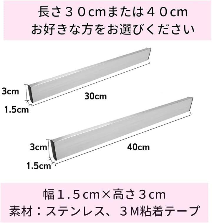「商品詳細」商品サイズ:長さ40cmx幅1.5cmx高さ3cm 素材:ステンレス、3M粘着テープ