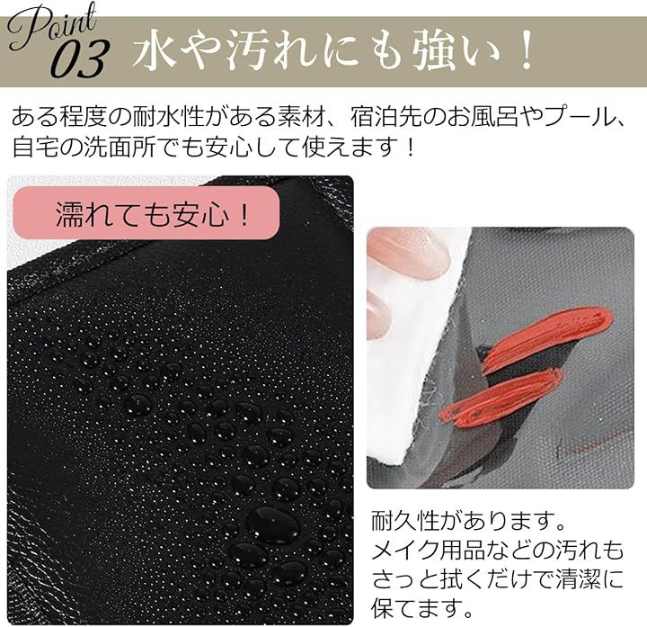 「ある程度の耐水性」ある程度、耐水性がある素材を使用しているため、洗面所まわりや移動中のちょっとした水はね、宿泊先のお風呂やプール、雨なども気になりにくく安心です。
