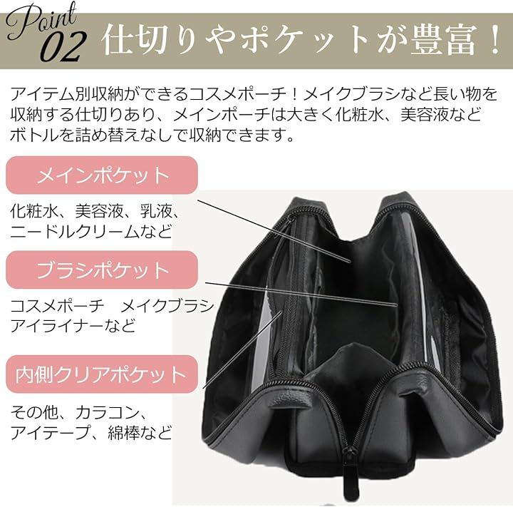 メインポーチは大きくて容量があり、化粧水や美容液、乳液、ニードルクリームなどのボトルを詰め替えなしで収納できます。