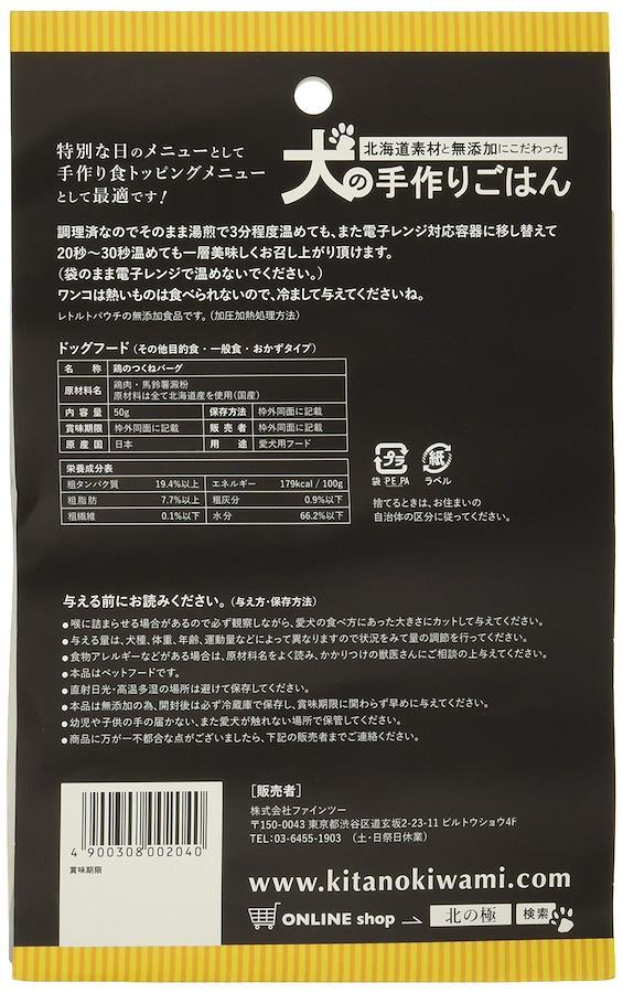 鶏のつくねバーグは北海道産。良質なたんぱく質に富み、低脂肪。栄養価に優れヘルシーな鶏肉は、ダイエットを気にする愛犬にもおすすめです。レトルト加工しておりますのでそのまま与えられます。