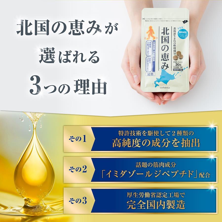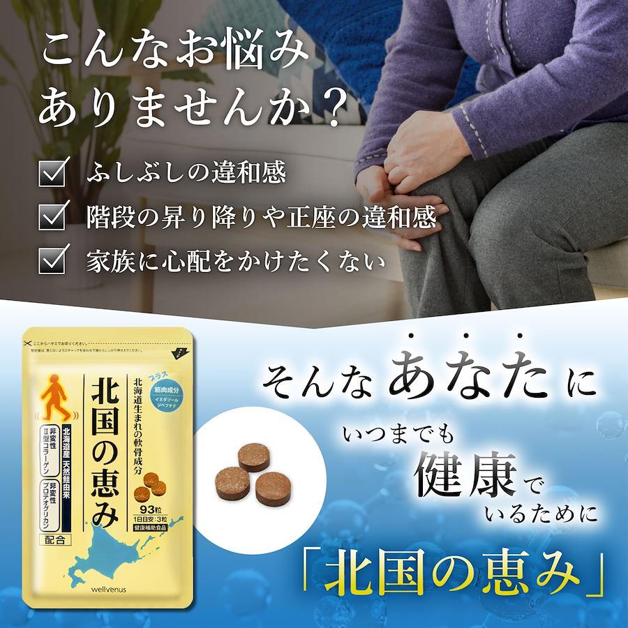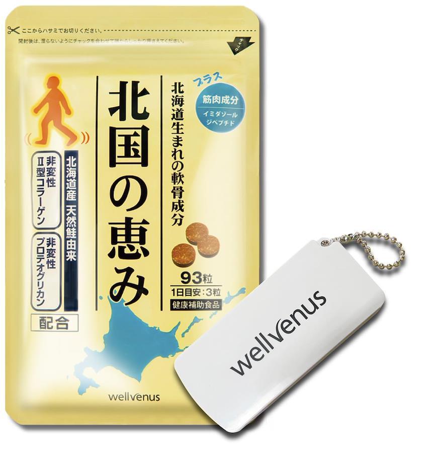 ■サイズ:??18.8x10.3x1.9cm;50g ?【愛され続けて累計販売数300万袋突破】2013年1月に販売を開始した『北国の恵み』は、愛され続けて「累計販売数が300万袋(※1)を突破」毎日たくさんの方にご愛飲いただいており、「お客様満足度はなんと91%(※2)」多くのお客様から3か月目で健やかな曲げ伸ばしを実感したとお喜びの声をいただいております。※1,93粒入り換算2013/1?2023/5。※2,「北国の恵み」の定期購入で3ヶ月目のお客様から無作為に抽出したお客様を対象にアンケート調査を実施。(2013年5月?6月)n=100 ウェルヴィーナスの「北国の恵み」を「満足」「やや満足」と回答した91名、「やや不満」「不満」と回答した方9名。) ?【プロテオグリカン】軟骨は水分を除くと「プロテオグリカン」と「2型コラーゲン」この2つの成分が約90%を占めています。ふしぶしのサプリといえば「グルコサミン」「コンドロイチン」などはよく耳にすると思いますが、実はそれらは「プロテオグリカン」の一部を構成している成分に過ぎません。それらの成分とは違い、軟骨そのものを構成する主成分である「プロテオグリカン」は、特徴的な形と水を集める特製から弾力と保水力に優れた軟骨成分です。 ?【2型コラーゲン】軟骨の主成分のうち、水分を除き一番多い成分は「2型コラーゲン」。軟骨を支える土台成分となっており、栄養素を留める働きも。『北国の恵み』には、様々な研究結果に基づいて、プロテオグリカンと2型コラーゲンを最適なバランスで配合しております。 ?【軟骨成分以外にもサポート成分をふんだんに配合】『北国の恵み』には、「プロテオグリカン」と「2型コラーゲン」に加え、軟骨成分のうちの1つである「ヒアルロン酸」、さらに筋肉成分として注目されている「イミダゾールジペプチド」含有のチキンエキスをしっかり配合。イミダゾールジペプチドとは動物の筋肉成分で、渡り鳥の羽の付け根などに多く含まれており、毎日の健康をサポートします。 ?【安心の品質管理、安心の世界実績】毎日飲むものだからこそ、安全性にもこだわって徹底的な品質管理を行っております。『北国の恵み』は、厚生労働省のガイドラインに基づいた国内GMP認定工場で品質を管理しております。「北国の恵み」はその品質が認められ、モンドセレクション最高金賞を受賞。※本製品は、GMP製品マークはつけられていませんが、GMP認定工場(認定番号11105)で製造されました。認定期間 2020年7月29日~2023年7月28日。さらに、確かな品質は世界的にも認められ、”モンドセレクション最高金賞”を2020年・2021年と連続で受賞しました。 ■重要なお知らせ安全上のお知らせ植物アレルギーのある方は、原材料名をご確認のうえ、ご使用をお決め下さい。原材料・成分還元麦芽糖水飴、デキストリン、ボスウェリアセラタ樹脂抽出物、キャッツクロー抽出物、鮭鼻軟骨抽出物(非変性プロテオグリカン、非変性Ⅱ型コラーゲン含有)、チキンエキス(イミダゾールジペプチド15%含有)、ビール酵母(セレン含有)、セイヨウシロヤナギ抽出物、セルロース、ステアリン酸Ca、微粒酸化ケイ素、抽出ビタミンE、ヒアルロン酸、ビタミンB1、ビタミンB6、ビタミンD、ビタミンB12※植物由来原料を使用しているため、錠剤の表面に茶色斑点が出ることがありますが、品質には問題ありません。使用方法1日当たり3粒を目安に水またはぬるま湯などでお召し上がりください。