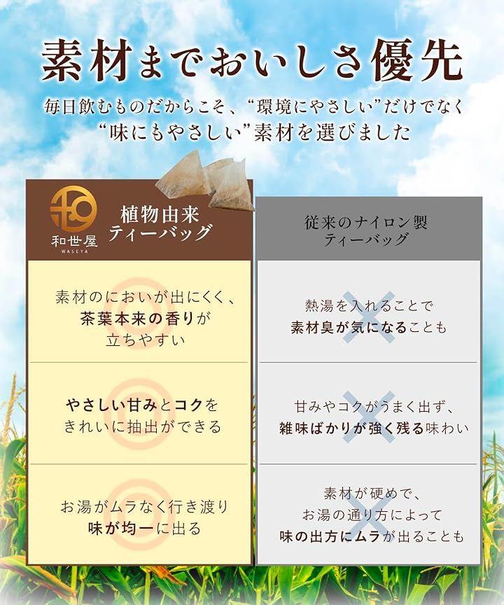 「地球にもカラダにも優しい土に還るティーバッグ使用」和世屋のお茶は、一般的な不織布のティーバッグを使用せず、とうもろこしから生まれた植物素材のティーバッグを使用しています。