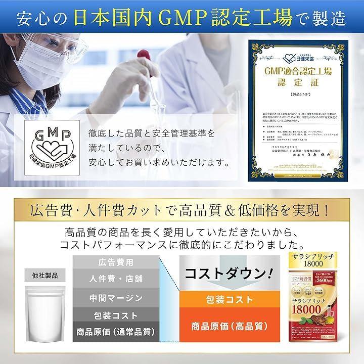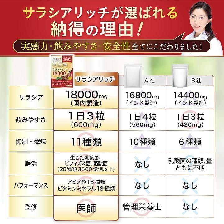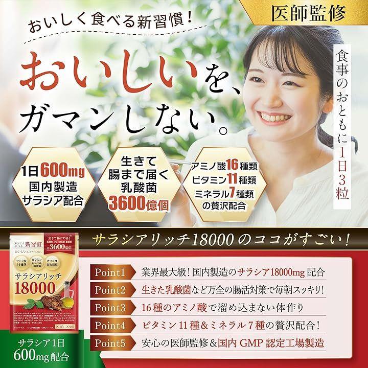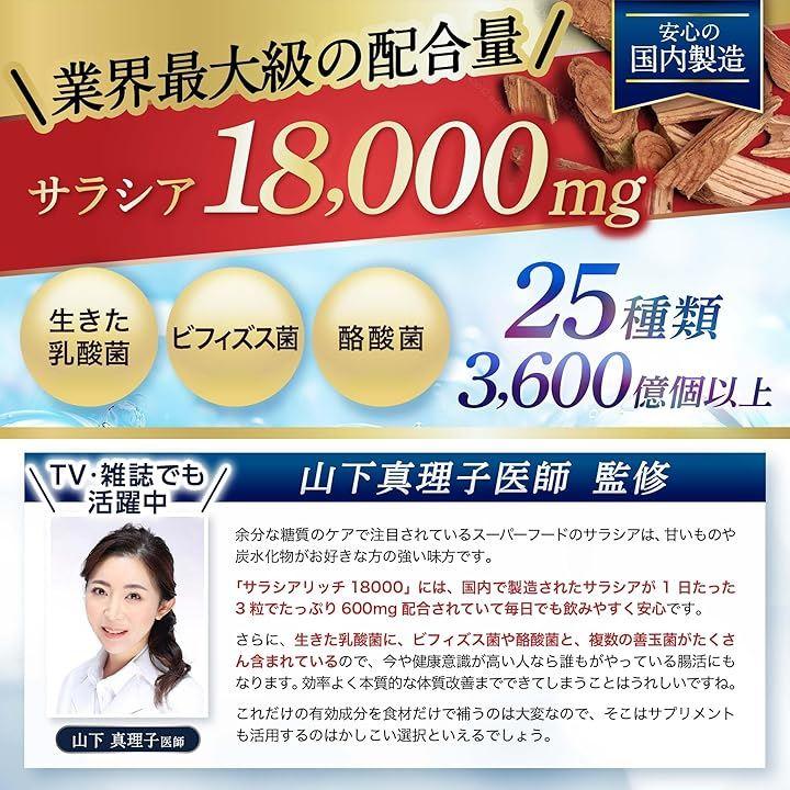 「医師監修」サラシアリッチ18000は、1袋あたりに国内製造のサラシア18,000mg、生きた乳酸菌・ビフィズス菌・酪酸菌など25種類3,600億個以上をたっぷり配合したサプリメントです。