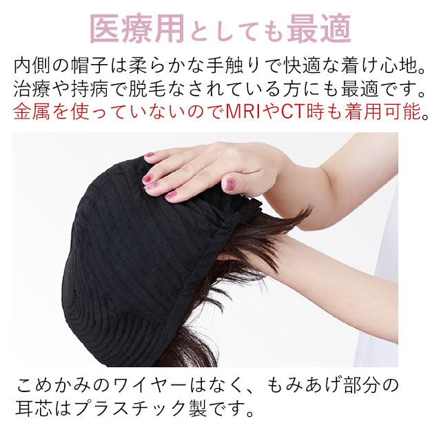 帽子ウィッグはこめかみ部分にもワイヤーが付いておらず、金属素材は不使用のためMRIやCTスキャン時も着用可能です。