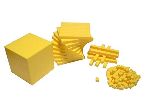 1のキューブ・・・・・100個 10×10×10㎜10の棒・・・・・10本 10×10×100㎜100の板・・・・・10枚 100×100×10㎜1000のキューブ・・・・・1個 100×100×100㎜10の棒、100の板、1000の立方体すべてに縦、横、高さに10㎜ごとに線が記されています。