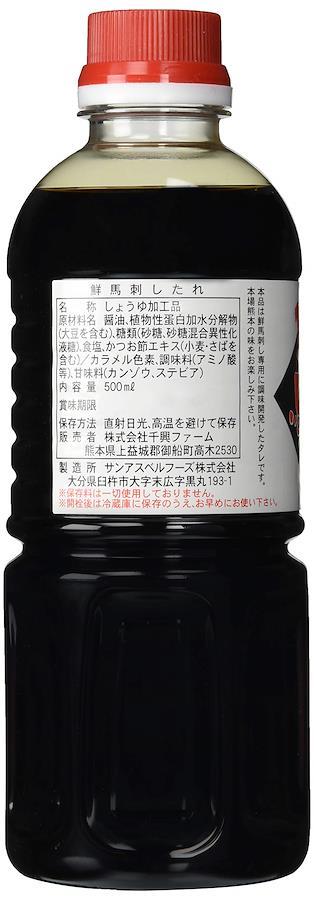 鮮馬刺しに合わせた専用のタレです。甘口でよく合います。~千興ファーム~千興ファームでは、阿蘇に馬専用の自主ファームと、 日本唯一の馬肉専用生産場を持ち、 安全性は国際品質の証明であるSQFを取得。220年以上受け継がれる熊本の郷土料理"鮮馬刺し"を今も、これからも。