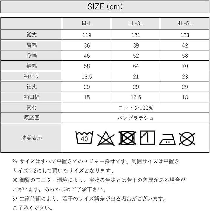 どなたにもにも気軽に楽しんでいただけるよう、M-L、LL-3L、4L-5Lの3サイズをご用意。「サイズ」[M-Lサイズ]総丈:119cm、肩幅:36cm、身幅:46cm、裾幅:58cm、袖ぐり:18.5cm、袖丈:29cm、袖幅:19cm、袖口幅:15cm[LL-3Lサイズ]総丈:121cm、肩幅:39cm、身幅:52cm、裾幅:64cm、袖ぐり:21cm、袖丈:29cm、袖幅:22cm、袖口幅:16.5cm[4L-5Lサイズ]総丈:123cm、肩幅:42cm、身幅:58cm、裾幅:70cm、袖ぐり:23cm、袖丈:29cm、袖幅:24cm、袖口幅:18cm「素材」コットン100%「裏地」なし「透け感」淡色については多少あり「伸縮性」ややあり「生地の厚さ」やや薄い「原産国」バングラデシュ* サイズは全て平置きでのメジャー寸法です。