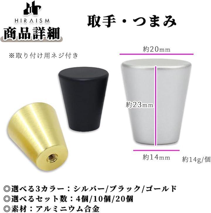 「商品内容」取っ手・つまみ 数量:4個/10個/20個 カラー:シルバー/ブラック/ゴールド 素材:アルミニウム合金 サイズ:面幅20mm 高さ23mm 底幅14mm 重量:14g /個 *取り付け用ネジ付き