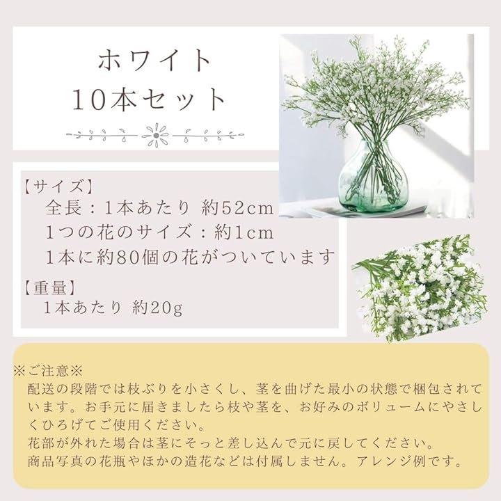 「カラー」白 「数量」10本 「サイズ」全長:1本 約52cm 1つの花のサイズ:約1cm 1本に約80個の花がついています 「重量」1本あたり 約20g