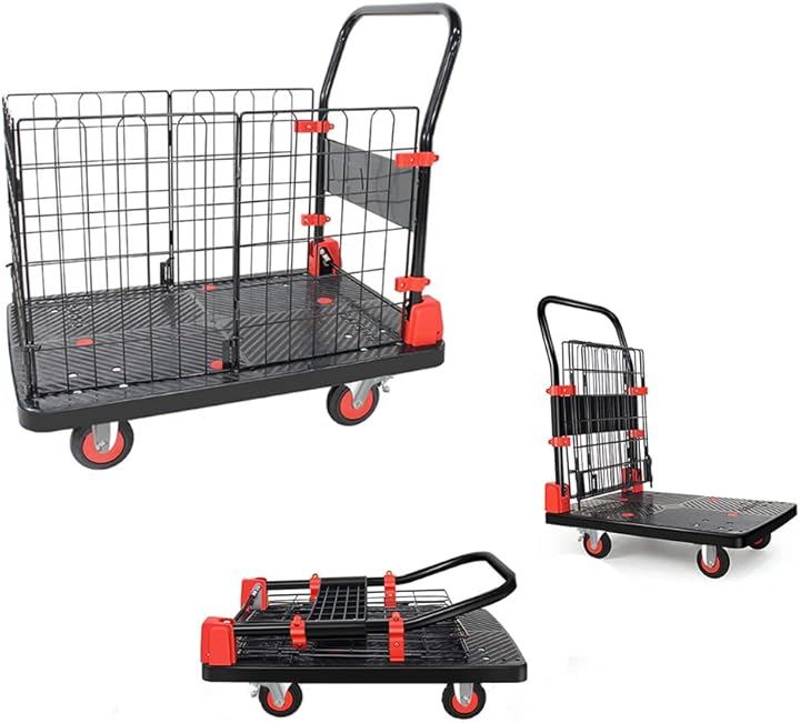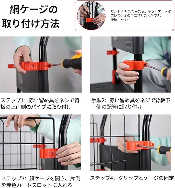 「カゴ付き台車」 囲い網が装備されており、荷物がしっかりと囲い込まれます。