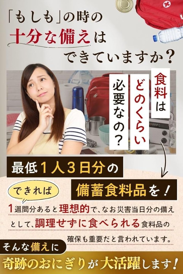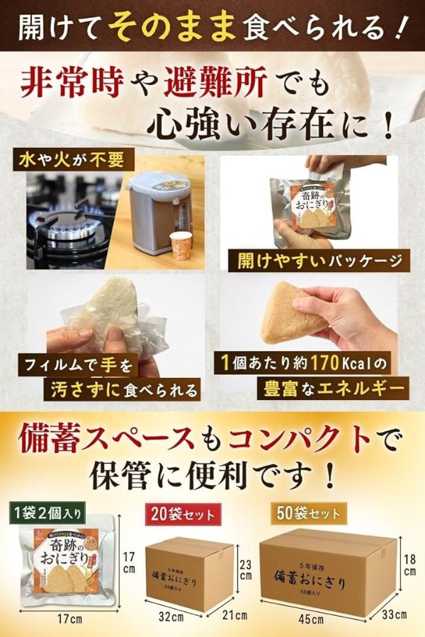 おにぎり1個あたり約170Kcalと豊富なエネルギーなため、非常食として最適です。