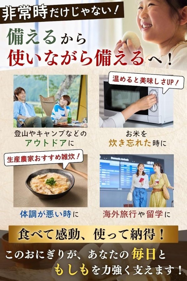 「普段の常備食として」防災食品としてだけでなく、アウトドアや海外旅行などで携帯おにぎりとしても活躍するおにぎりです。