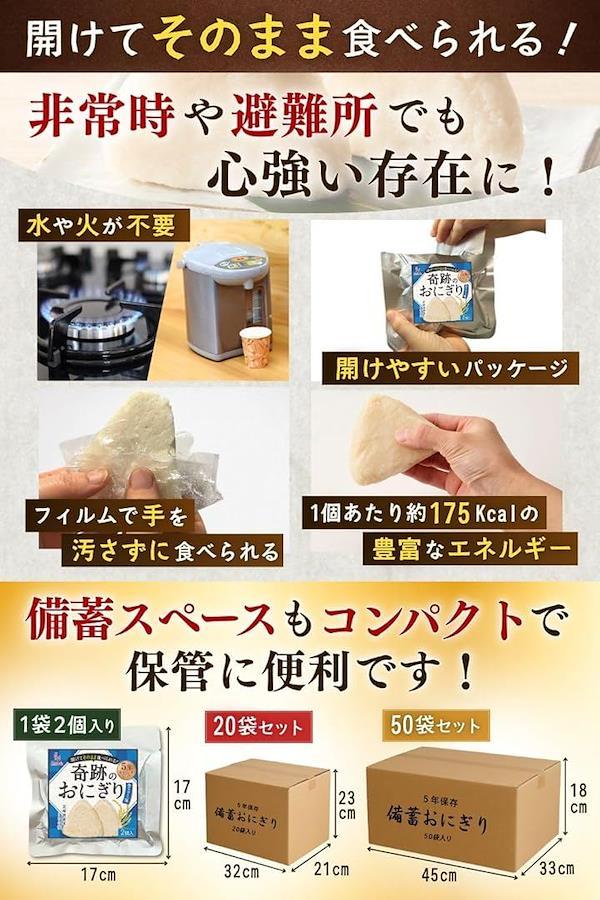 おにぎり1個あたり約175Kcalと豊富なエネルギーなため、非常食として最適です。