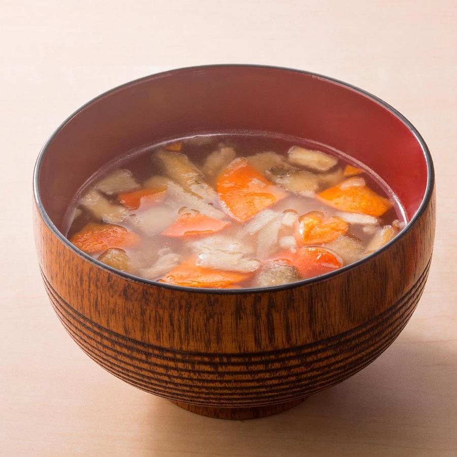 フリーズドライで本格的なとん汁を再現。味噌味をベースにして、豚肉・人参・大根・ごぼうを具材に配合しています。