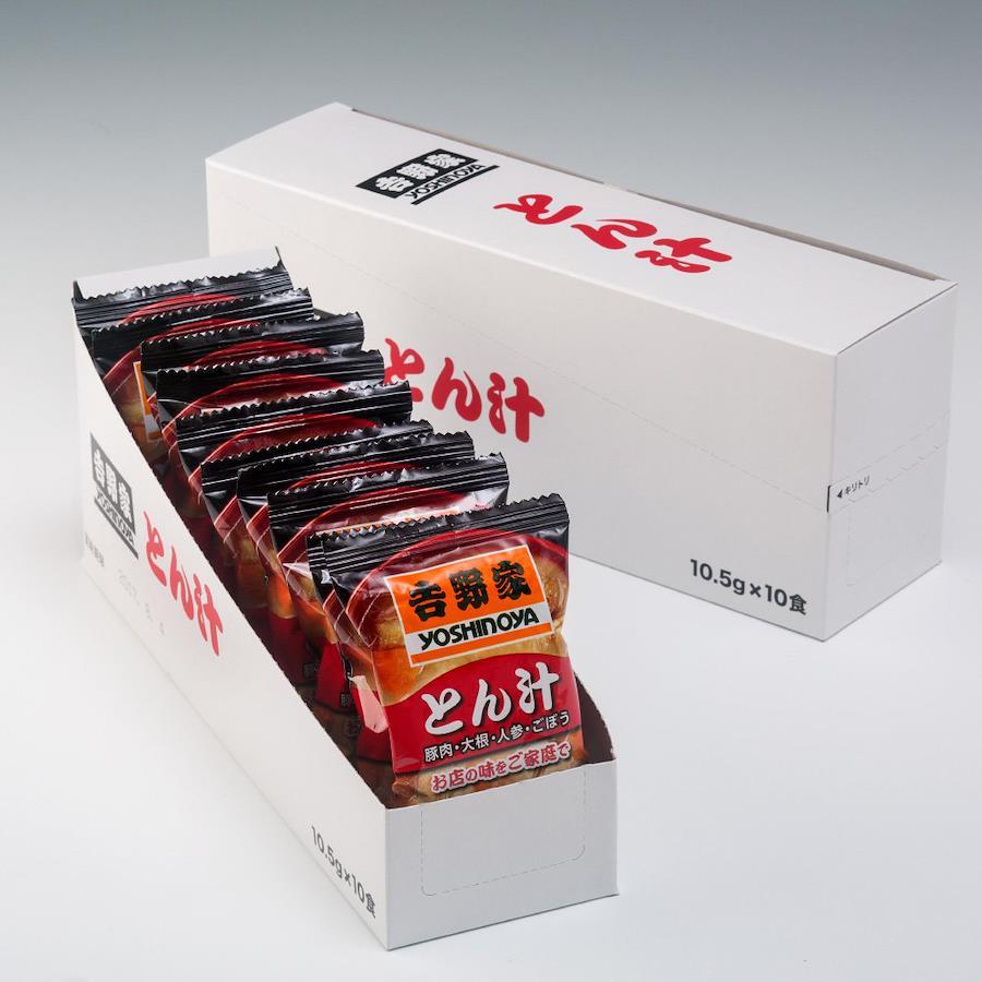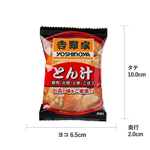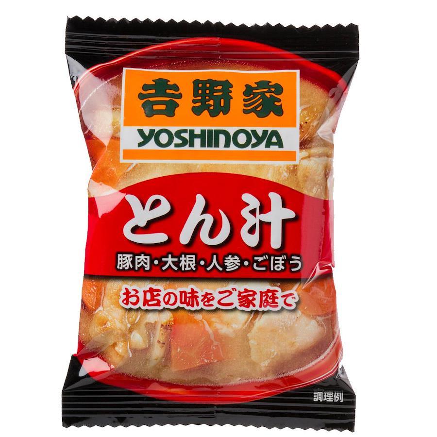 【吉野家のとん汁】フリーズドライで本格的なとん汁を再現。寒い季節はもちろんのこと、夏場のアウトドアなどでも嬉しい吉野家のとん汁。作るとなると材料が余ってしまう……という方にもぴったりです。フリーズドライなので、お湯をかけてすぐにお召し上がりになれます。【簡単便利】味噌味をベースにして、豚肉・人参・大根・ごぼうを具材に配合しています。常温便でのお届けです。お湯をかけて、かき混ぜてお召し上がりください。【お取り寄せグルメ】お湯を注ぐだけでで簡単に調理出来ますので、手早くご飯を済ませたい方や、おかずの一品としてもご家庭でお楽しみいただけます。贈り物や、一人暮らしの方へのプレゼントにも好評いただいております。※なお、ラッピングやギフトメッセージ等は対応しておりません。【商品詳細】▼セット個数:とん汁(9.0g)×20袋 ▼特製アレルギー物質:乳、大豆 ▼成分:たんぱく質(g):2.4/ 脂質(g):1.0/ 炭水化物(g):4.8/ 食塩相当量(g):2.0 ▼注意:残存賞味期限5カ月以上でのお届けとなります。【原材料】みそ、醤油、野菜エキス、でん粉、昆布エキス、ポークエキス、清酒、酵母エキスパウダー、かつお節エキス、砂糖、食塩、椎茸エキスパウダー、ゼラチン、具(豚肉、大根、人参、ごぼう)/酸化防止剤(ビタミンE)、(一部に小麦、大豆、鶏肉、豚肉、ゼラチンを含む)【重要】メーカーによる商品リニューアルに伴いパッケージ(内容量も含む)変更が行われた場合、新パッケージでお届け致します事ご了承願います。