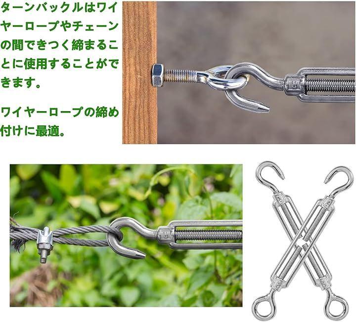 「幅広い用途」:強風対策などカーポートの固定、倒れそうな恐れのある樹木などの固定、物置やその他の構造物の固定など、物干しロープの引き上げ、装飾照明用のワイヤーを掛けますフェンスのリンク、トラックキャンピングカーの固定など。