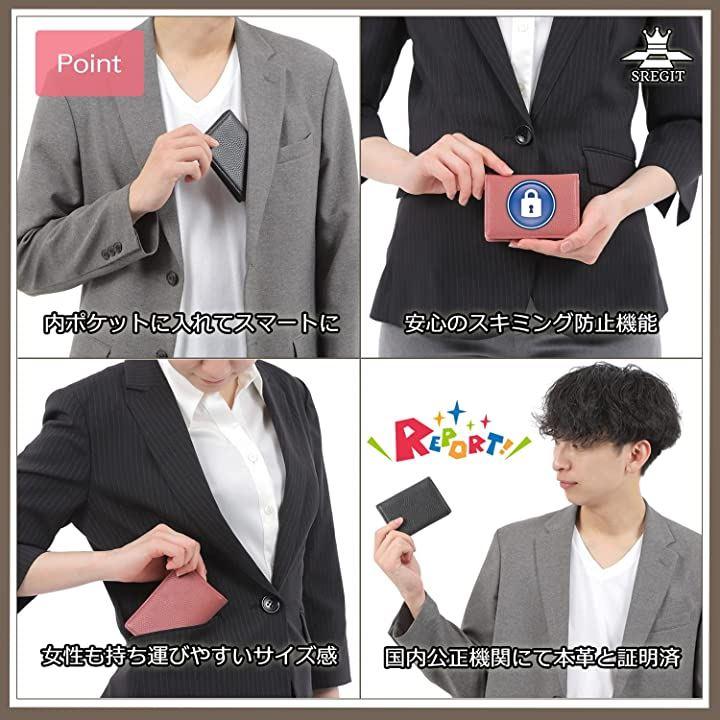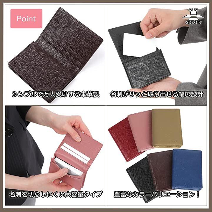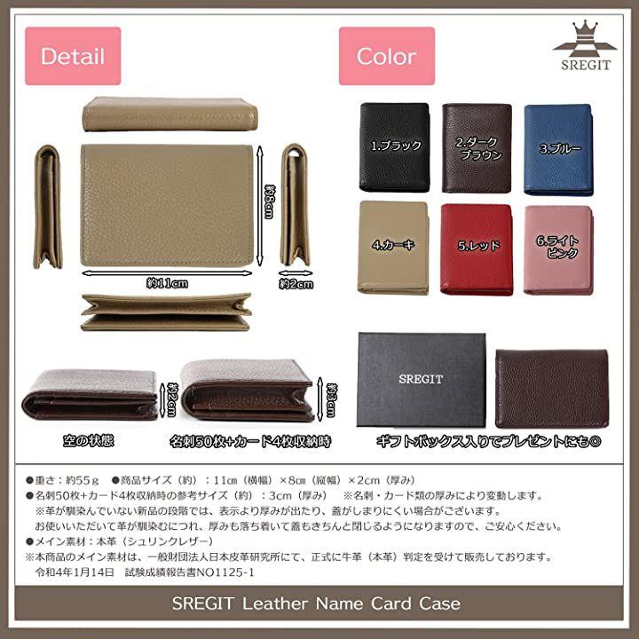 ・「商品詳細」 *ブランド名:SREGIT(スレジット) *メイン素材:シュリンクレザー(牛革)(*本革証明済/令和4年1月14日・No1125-1) *カラー:ブラック、ダークブラウン、ブルー、カーキ、レッド、ライトピンク *サイズ(約):横11cmx縦8cmx厚さ2cm *厚みの変動(約):2cm(革が馴染んで何も入れていない状態)~3cm(通常の名刺50枚+カード4枚を入れた状態) *重量:約55g *収納:メインポケットx1、フリーポケットx4 *最大収納数:名刺50枚+カード4枚(*名刺・カードの厚みによる) *機能:スキミング防止機能 用途:名刺入れ(めいしいれ)・カードケース 対象:女性・男性