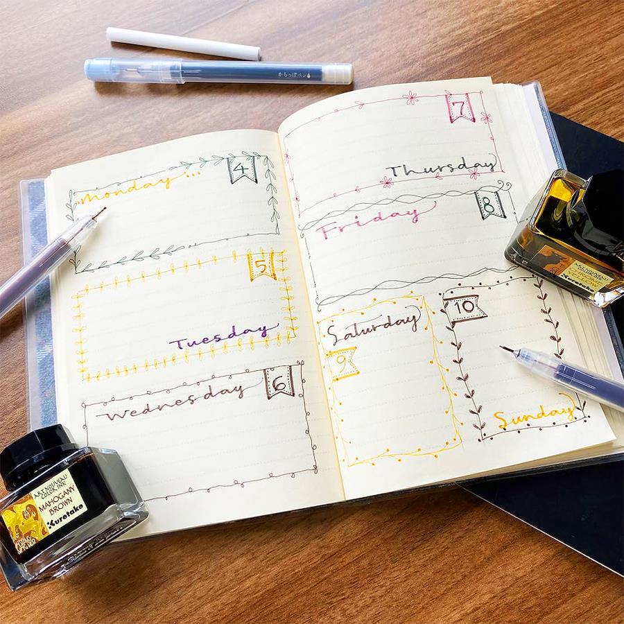 簡単に組み立てられてお気軽に持ち運びできるので、手帳やノートなどをお好きなインク色で彩ることができます。