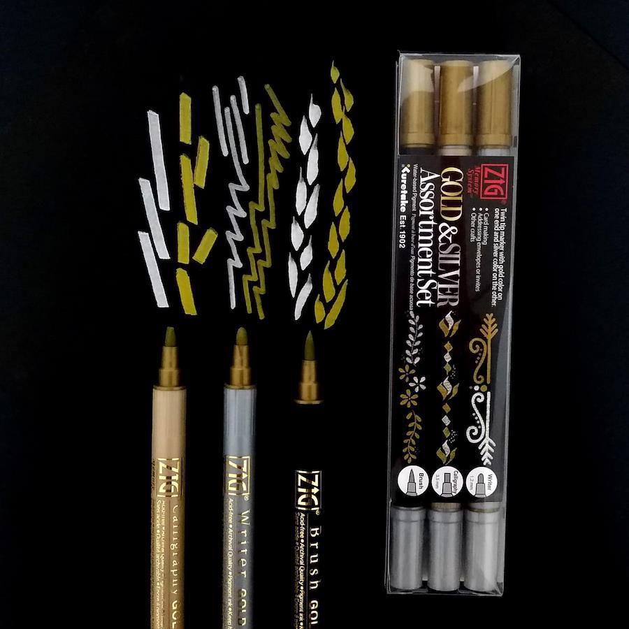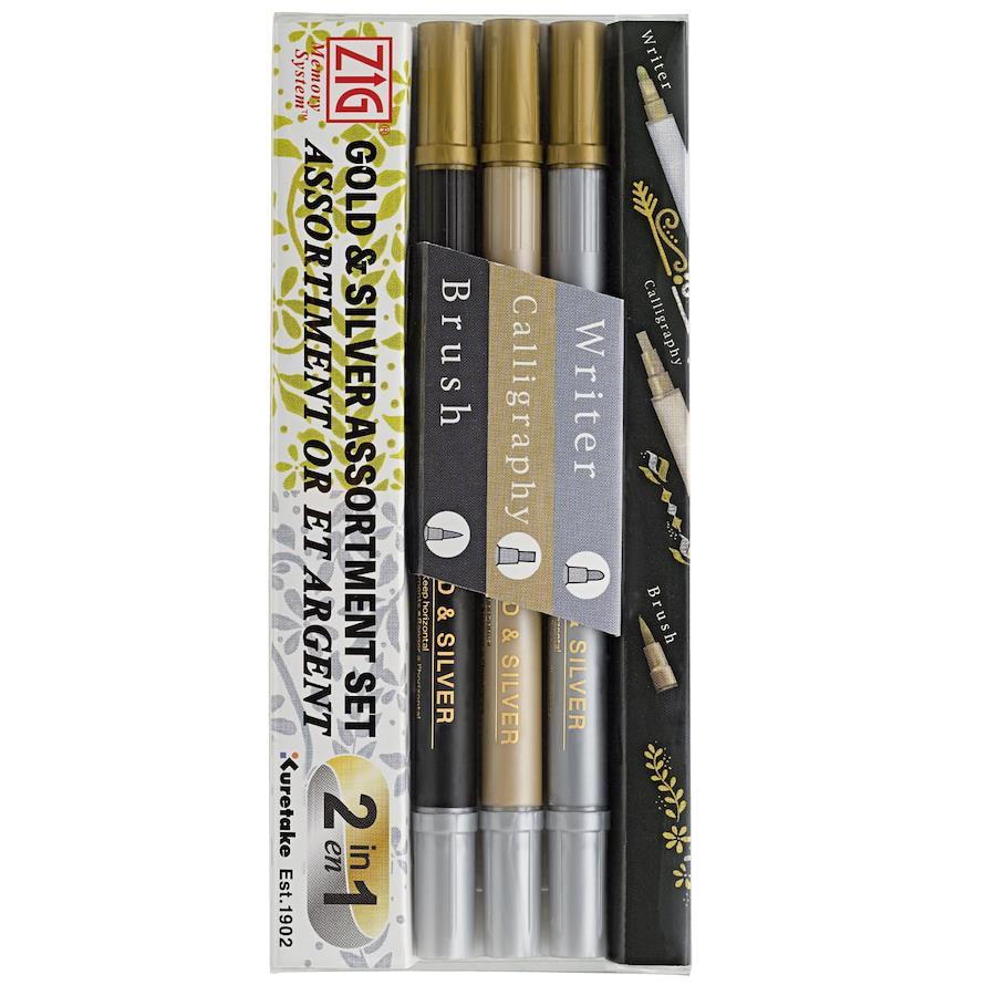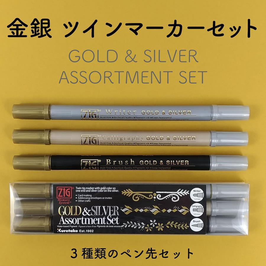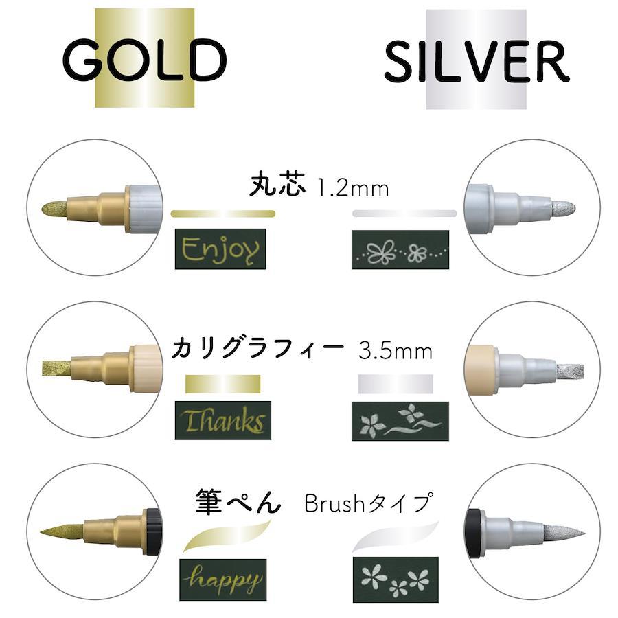 【内容】ツインマーカー金・銀 3本セット:丸芯(1.2mm)・カリグラフィー(3.5mm)・筆ペン(Brush)