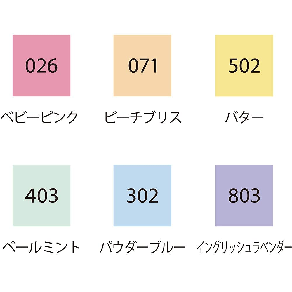 BABY PINK、PEACH BLISS、BUTTER、PALE MINT、POWDER BLUE、ENGLISH LAVENDER各1本のマイルドなカラーの6色セットです。