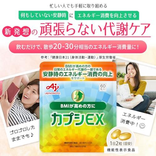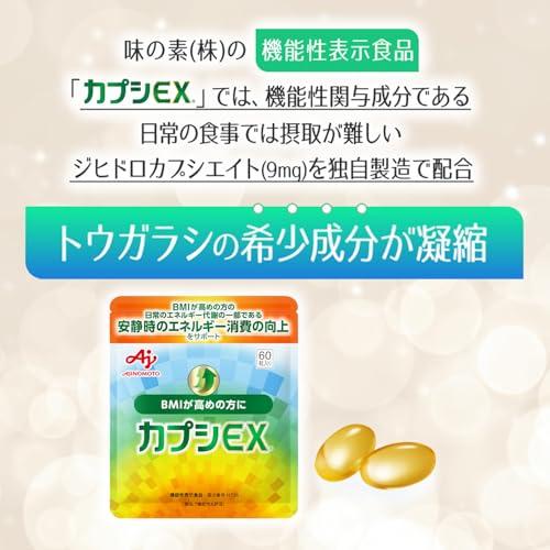 エネルギー消費の向上をサポートする、味の素(株)のサプリメントです。 【届出表示】本品にはジヒドロカプシエイトが含まれるので、BMIが高めの方の日常のエネルギー代謝の一部である安静時のエネルギー消費の向上をサポートする機能があります。 ・本品は、特定保健用食品と異なり、消費者庁長官による個別審査を受けたものではありません。・本品は疾病の診断、治療、予防を目的としたものではありません。・食生活は、主食、主菜、副菜を基本に、食事のバランスを。