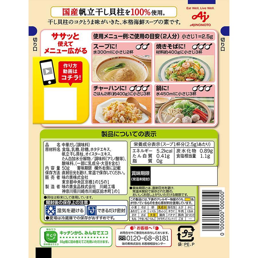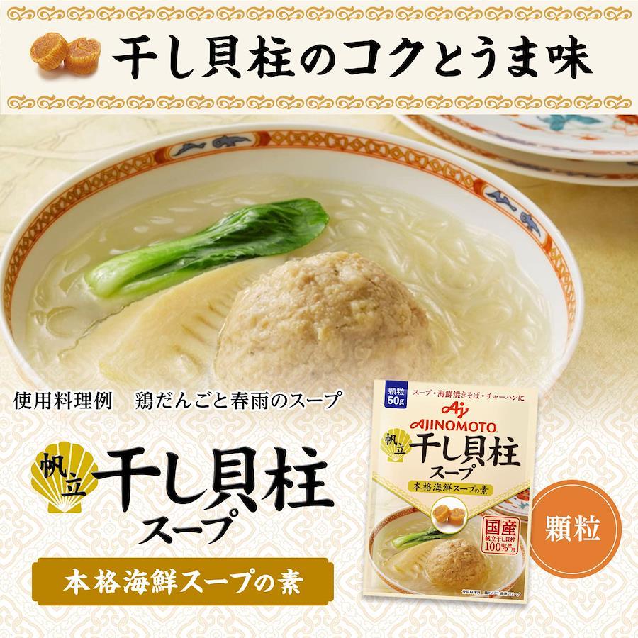じっくり丁寧に熟成された国産の帆立干し貝柱を100%使用した本格的な海鮮中華スープの素です。素材の味をいかせる、上品でやさしい味わいです。干し貝柱の豊かな香りとうま味がご家庭の中華料理を手軽に本格的な深い味わいに仕上げます。特に海鮮素材と合いますので、海鮮素材を使ったメニューをお勧めします。