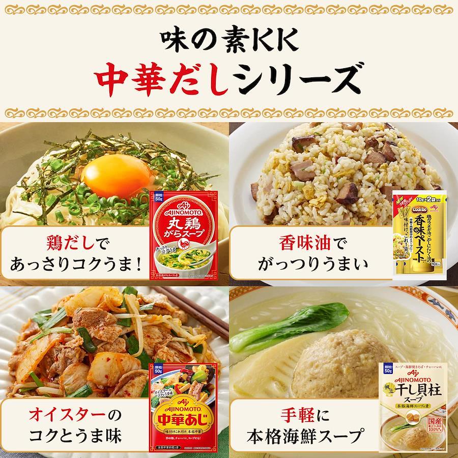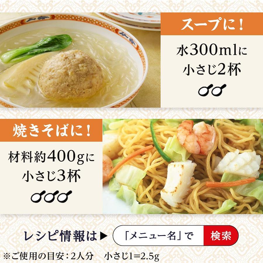 2人分のご使用の目安 スープ(水またはお湯300ml)に小さじ2杯、野菜炒め(約400g)、焼きそば(2玉)小さじ3杯、中華粥に小さじ1杯