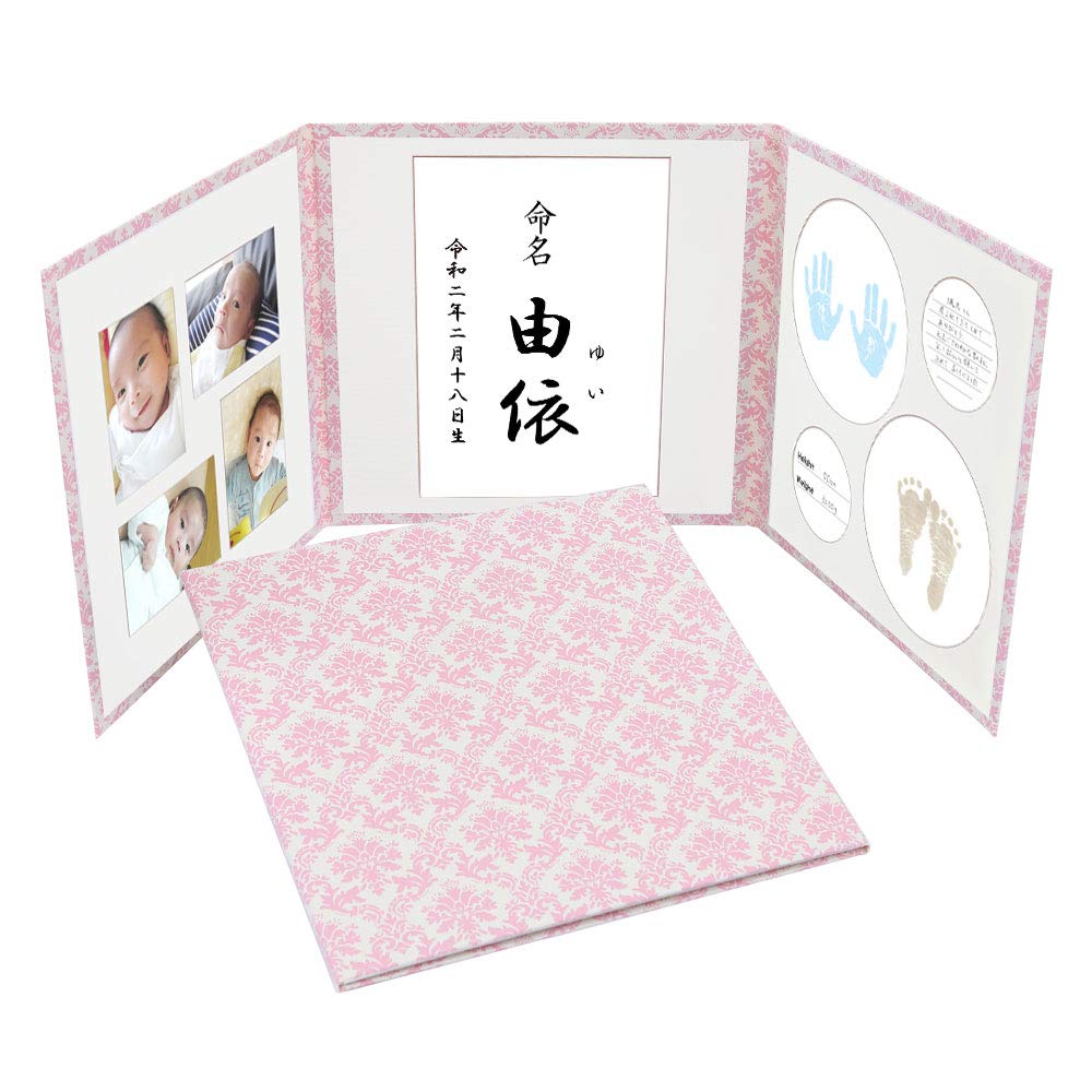 サイズ: 縦31cm×横31cm 厚さ0.7cm 表紙材質: 高級感ある上品なダマスク表紙中枠3枚(命名書用/L判写真4枚用/手形・足形用)・命名紙2枚・手形・足形用紙3枚付き 日本製
