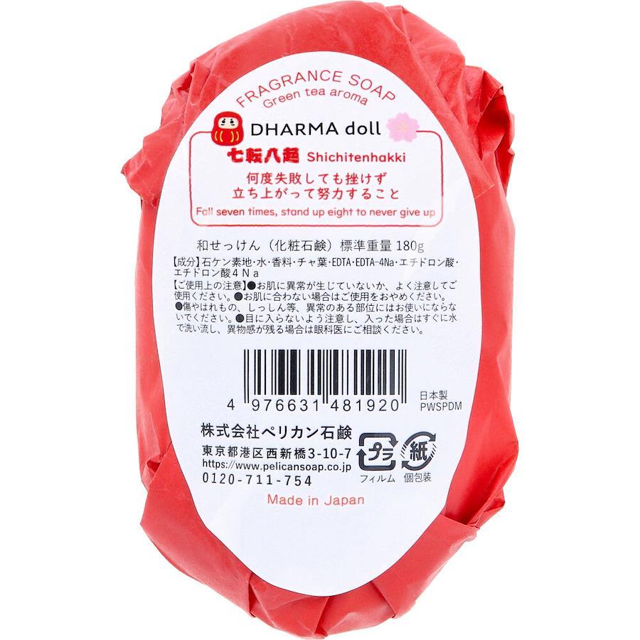 フレグランスソープ Green tea aroma●ひとつでプレゼント感溢れる180gという大きめのサイズと外国の方が好きなイラストと漢字を大きく配置し、目を引くデザインになっています。●香りは和を感じる新緑の香りです。★七転八起:何度失敗しても挫けず立ち上がって努力すること。
