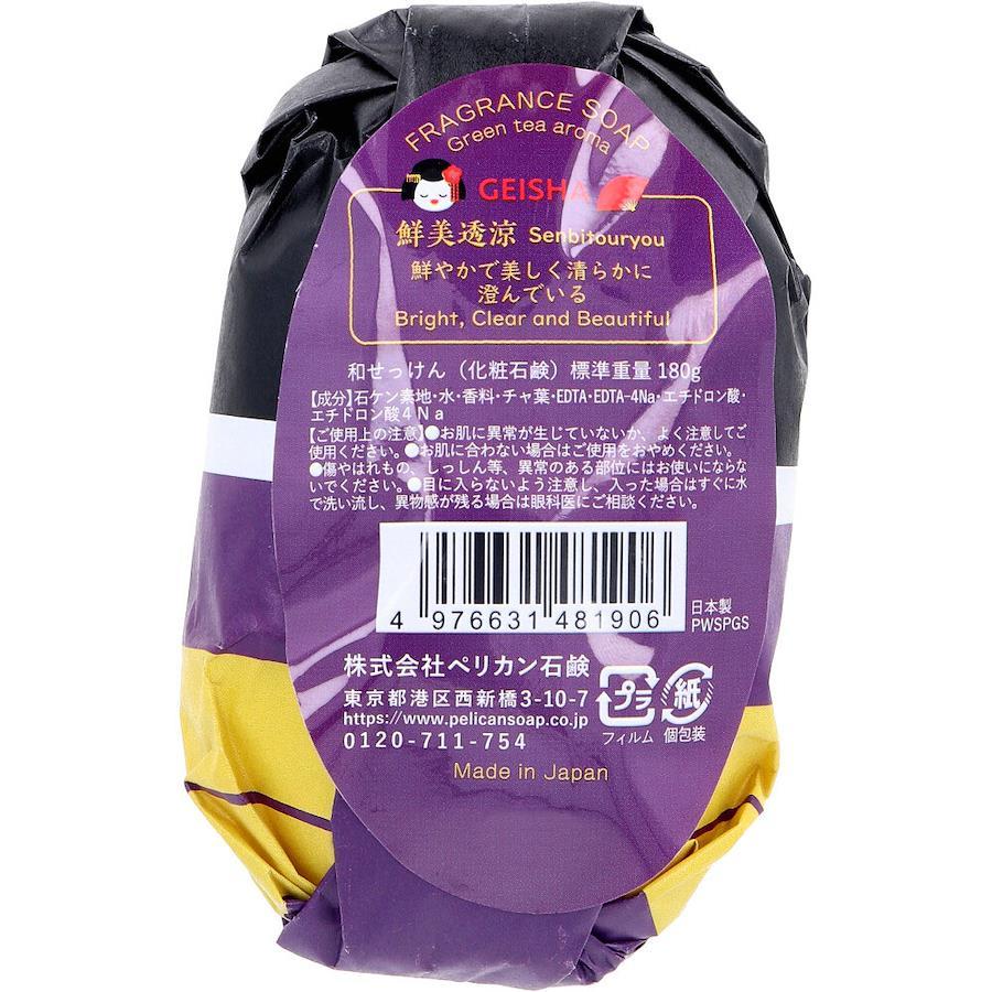フレグランスソープ Green tea aroma●ひとつでプレゼント感溢れる180gという大きめのサイズと外国の方が好きなイラストと漢字を大きく配置し、目を引くデザインになっています。●香りは和を感じる新緑の香りです。★鮮美透涼:鮮やかで美しく清らかに澄んでいる。