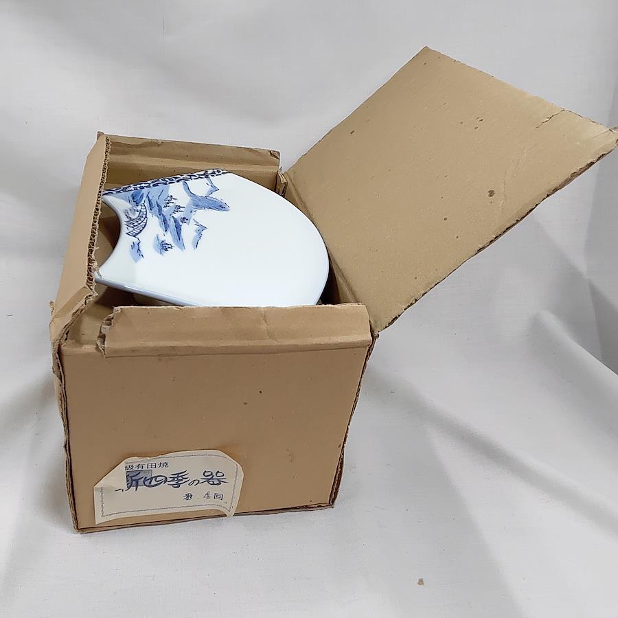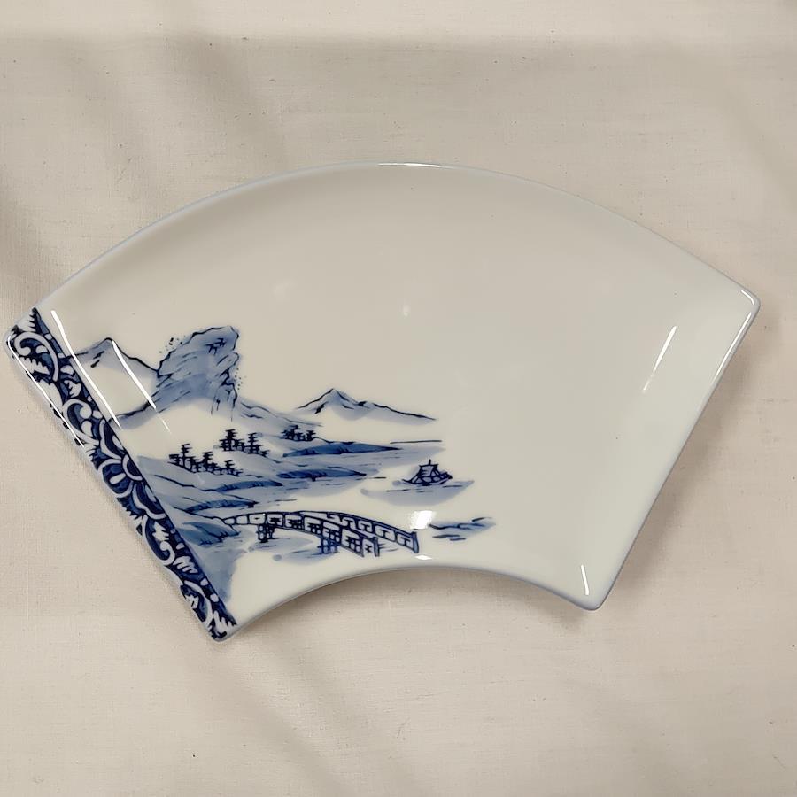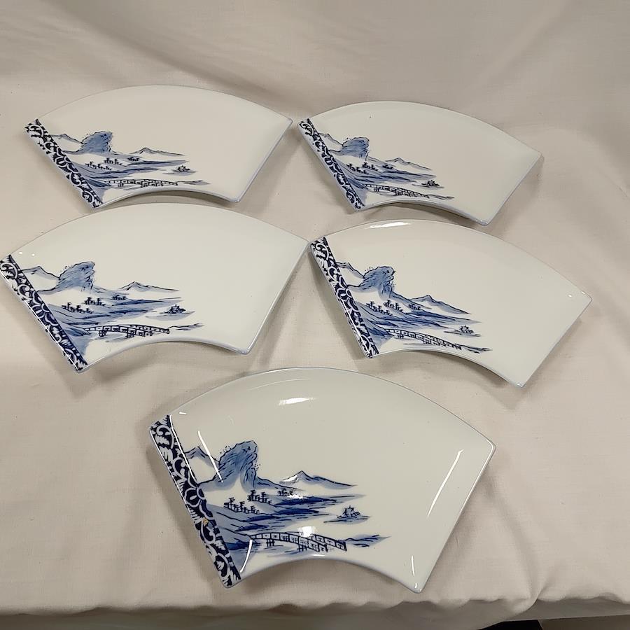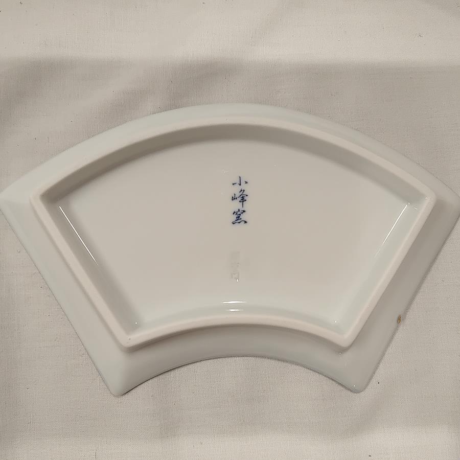 有田焼 和皿 刺し身皿 昭和レトロ 5枚セット。扇型の山水画のような風景が手描きで描かれた染付皿です。裏には小峰窯の銘があります。未使用ですが長期保管により経年劣化があるかもしれません。軽くチェックしましたが傷もなく美品です。
