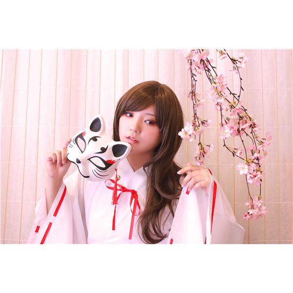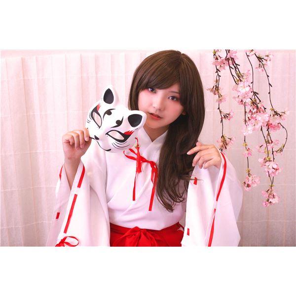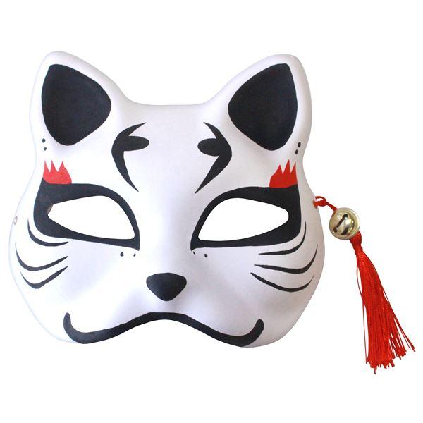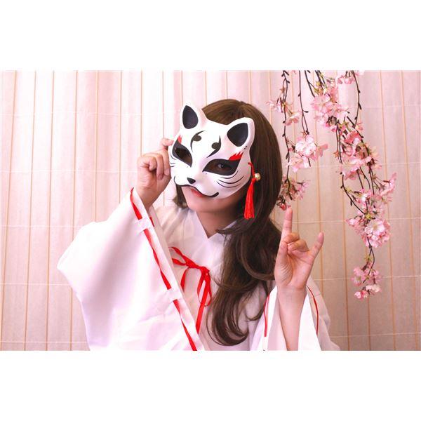 半面タイプのきつねお面。白地に黒と赤の塗り化粧が映えます。サイドに付いた鈴付のタッセルが華やかです。お面は硬い紙製でしっかりしています。
