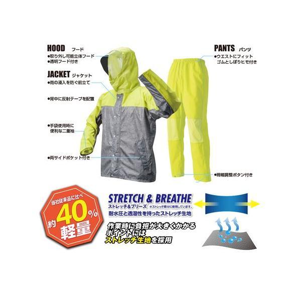 ●上着は、水の侵入を防ぐ前たて、手袋使用時に便利な2重袖、視認性の良い透明フード、左右両サイドにポケットと機能満載!