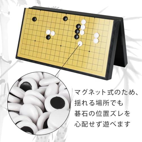 正式な数(黒181個、白180個)の碁石が入った、折りたたみ式の囲碁セットです。碁石は専用のケースに入れて収納できるので、中でバラバラに混在することがありません。コンパクトに畳めるため、旅行や出先にも気軽に持ち運べるポータブル仕様です。 盤面と碁石にはマグネットを搭載しており、対局中や休憩中にズレにくい仕様に仕上げました。新幹線や夜行バスなど揺れる車内でも使用できる便利なアイテムです。 正式な囲碁盤である19路盤を採用し、初心者から上級者まで幅広くご使用いただける囲碁セットは、誕生日やクリスマスプレゼントにお勧め。家族や友達とのコミュニケーションとしてもご活用いただけます。囲碁の練習や作成会議など幅広くお役立てください。 【セット内容】囲碁盤×1点 碁石(標準の黒181、白180) ※製造時期により盤面の色味が若干変更になる場合がございます。 【サイズ(約)】盤面:28.5cm×28.5cm×1.5cm 折り畳み時:28.5cm×14.2cm×3cm 碁石の直経:13mm 碁石の厚さ:3.5mm 【重量】0.6kg 【仕様】19路 ※本製品は"SooTune"から出品しておりますオリジナル商品となります。お客様にご迷惑をかけぬ様、他者様の出品を確認した場合はカスタマーサポートへ申告させて頂きます。