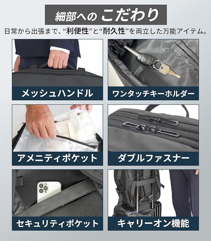 製品は、衣類やPC、A4サイズの書類などがスムーズに収納できる絶妙なサイズ感を実現し、大きすぎず小さすぎないため、日常使いからビジネスシーンまで快適にお使いいただけます。