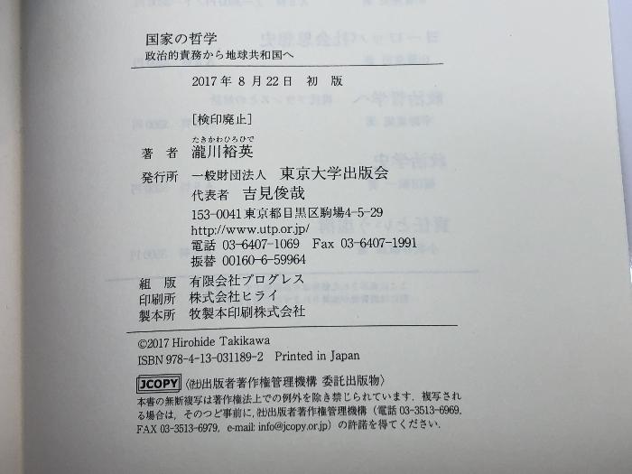商品名:国家の哲学: 政治的責務から地球共和国へ 東京大学出版会 瀧川 裕英