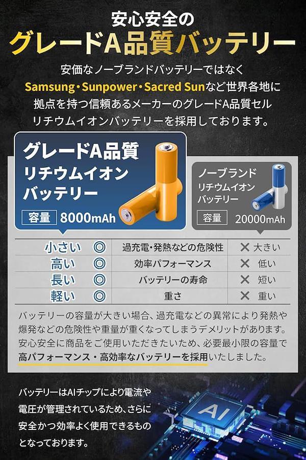 「グレードA品質xAIチップ」知名度の低いノーブランドバッテリーではなく、世界各地に拠点を持つ信頼あるメーカーのグレードA品質セルリチウムイオンバッテリーを使用しております。