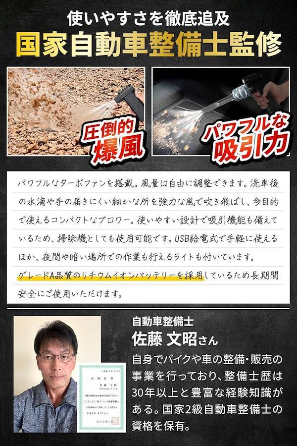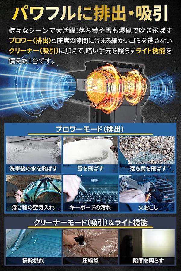 「使用例」*ブロワーモード(吹き飛ばし):洗車後の水気・車に積もった雪・落ち葉・キーボードに詰まった埃・浮輪への空気入れ・火おこしetc... *クリーナーモード(吸引):車内の掃除や圧縮袋etc...