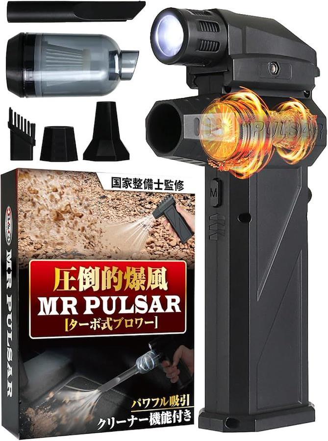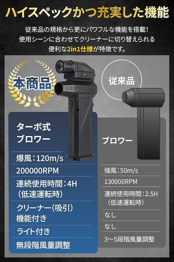「MR PULSARのスペック」一般的なブロワーとは異なり1分間当たりの回転数がなんと200,000RPM。片手で操作できるサイズ感&軽量設計ながらも爆風を生み出します。