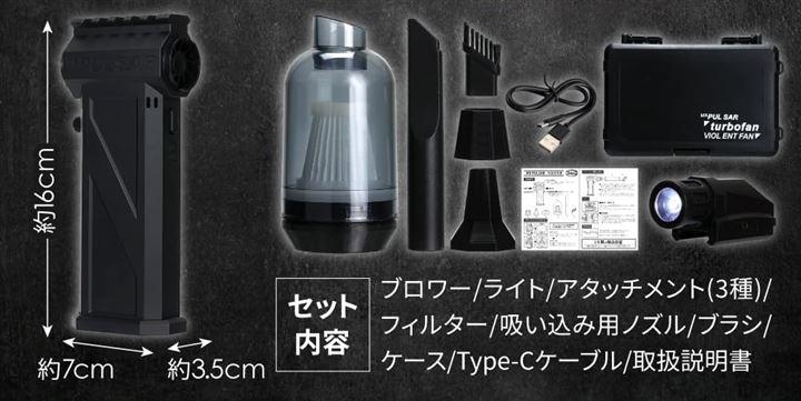 「セット内容」ブロワーx1点 ライトx1点 アタッチメントx3種 フィルターx1点 吸い込み用ノズルx1点 ブラシx1点 ケースx1点 Type-Cケーブルx1点 取扱説明書x1点 「サイズ(約)」本体:16cmx7cmx3.5cm