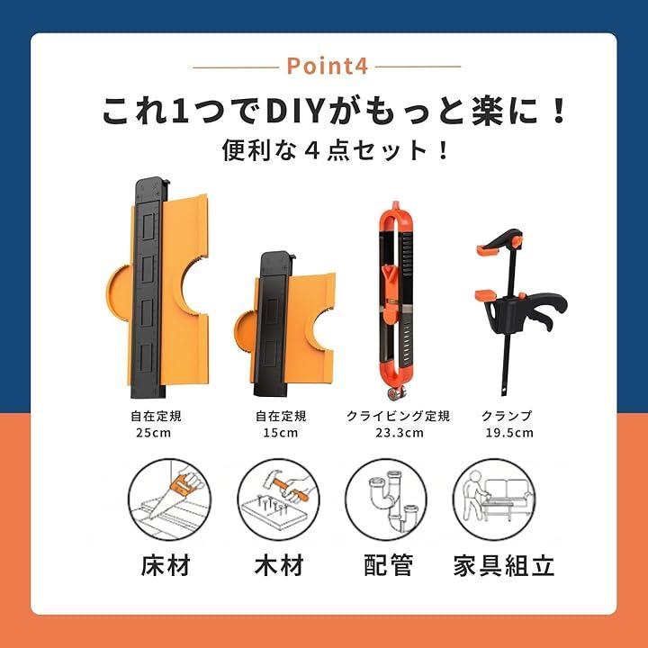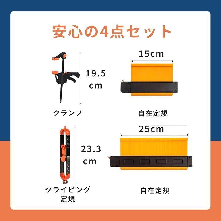 「効率的な作業を叶える4点セット内容」 自在定規25cm・15cm、クライビング定規23.3cm、クイックバークランプ19.5cmをセット。