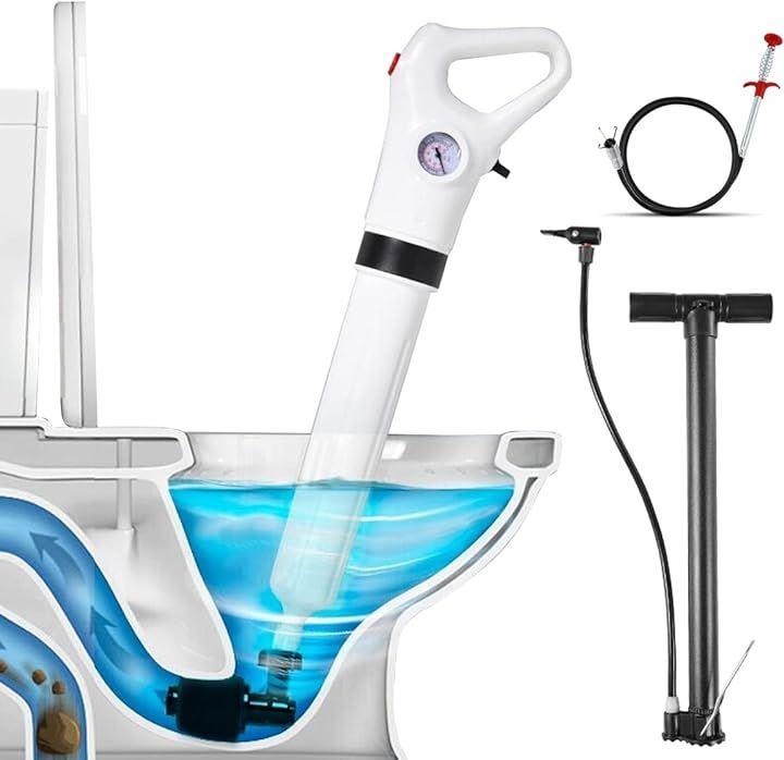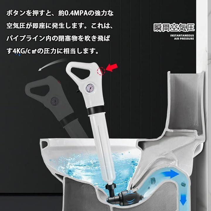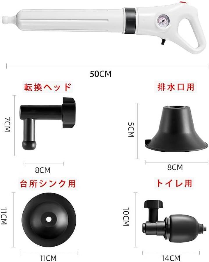 メモリタイプの空気圧力計が付いてるので、空気の入れすぎなどを防ぎ、用途によって空気圧を加減でき、排水溝やトイレの破損、汚水の逆噴射などを防ぐことができます。