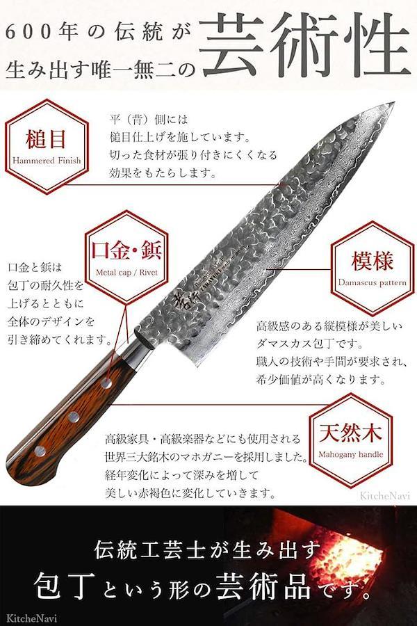 「サイズ・仕様」刃渡り:210mm、全長:330mm、刃幅:46mm、刃厚2mm、重さ:190g、刃材:ステンレスダマスカスV金10号鋼割込、両刃両刃