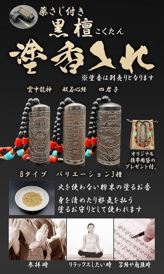 本塗香入れでは、雲中に寛雅に舞う龍が艶やかに彫られており、龍が発するエネルギーやご加護を強く感じることができます。